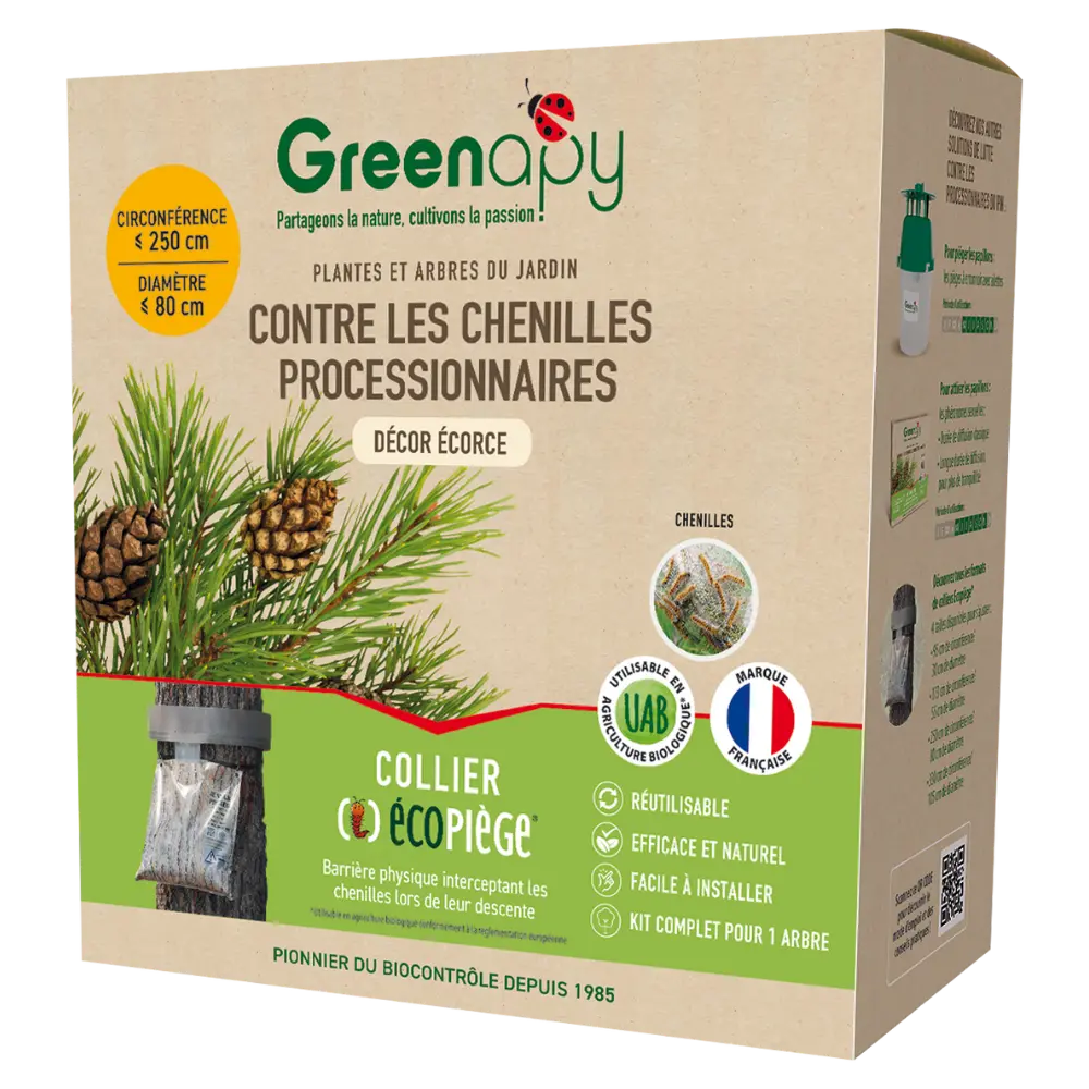 Il est facile et rapide à l’installation. Une fois posé, vous ne vous en occupez plus. Le piège est conçu pour résister l’hiver. Il existe en 4 diamètres afin de s’adapter à la taille de votre arbre. Il peut se fixer en hauteur pour le rendre inaccessible aux enfants et aux animaux domestiques en limitant le risque d’urtication dû aux poils. Un piège par arbre est recommandé et il peut être ré utilisé d’une année sur l’autre, vous disposez d’un kit de recharge à commander chez Nos Distributeurs pour renouveler l’usage du piège la saison suivante.